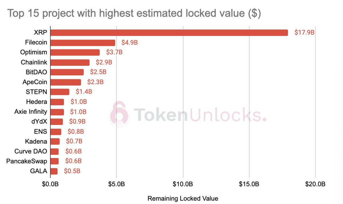 Token Unlocks, 2023 yılı içinde 102 milyar dolar değerinde coin ve token’ın kilidini açacağını bildirdi. Paylaşılan tabloda öne çıkan 15 token’a dikkat çekildi. Bunlar arasında en yüksek kilitli değere sahip token’ın şu anda yaklaşık 18 milyar dolara ulaşan XRP olduğu gözlemleniyor. Onu Filecoin, Optimism, Chainlink, BitDAO, ApeCoin, STEPN gibi token’lar takip ediyor. Kripto paraların mevcut toplam piyasa değerinin bir trilyon doların biraz üzerinde olduğu görülüyor.