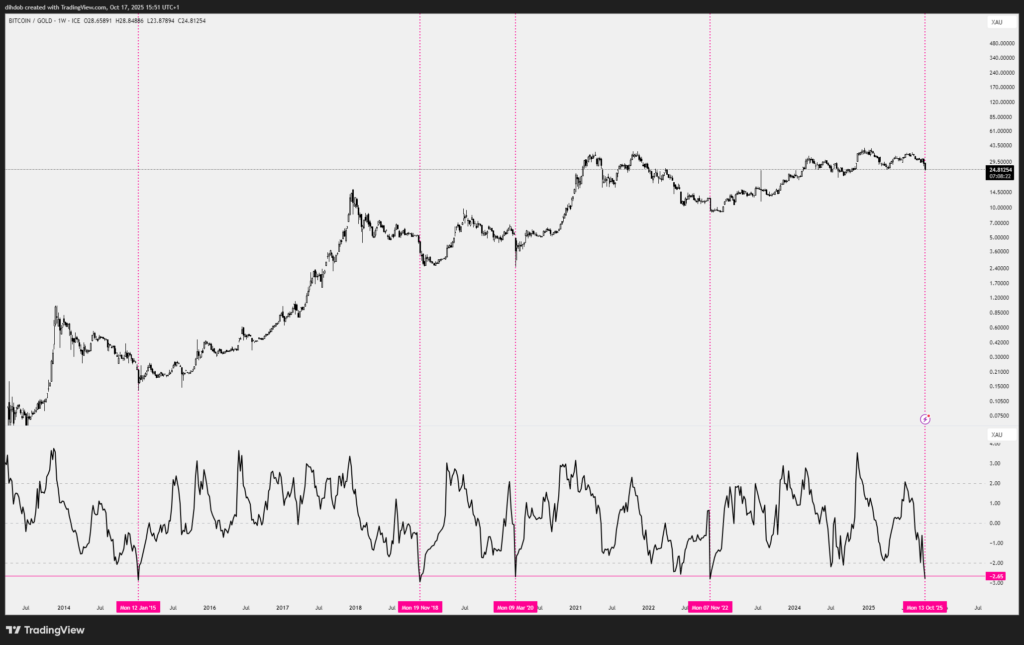 Analist Pat Christopher tarafından paylaşılan bir grafik, tarihte Bitcoin’in altına karşı bu kadar düşük değerlendiği sadece dört dönem bulunduğunu ortaya koydu. İlginç şekilde, bu dönemlerin tamamı Bitcoin için önemli dönüm noktalarına işaret etti.