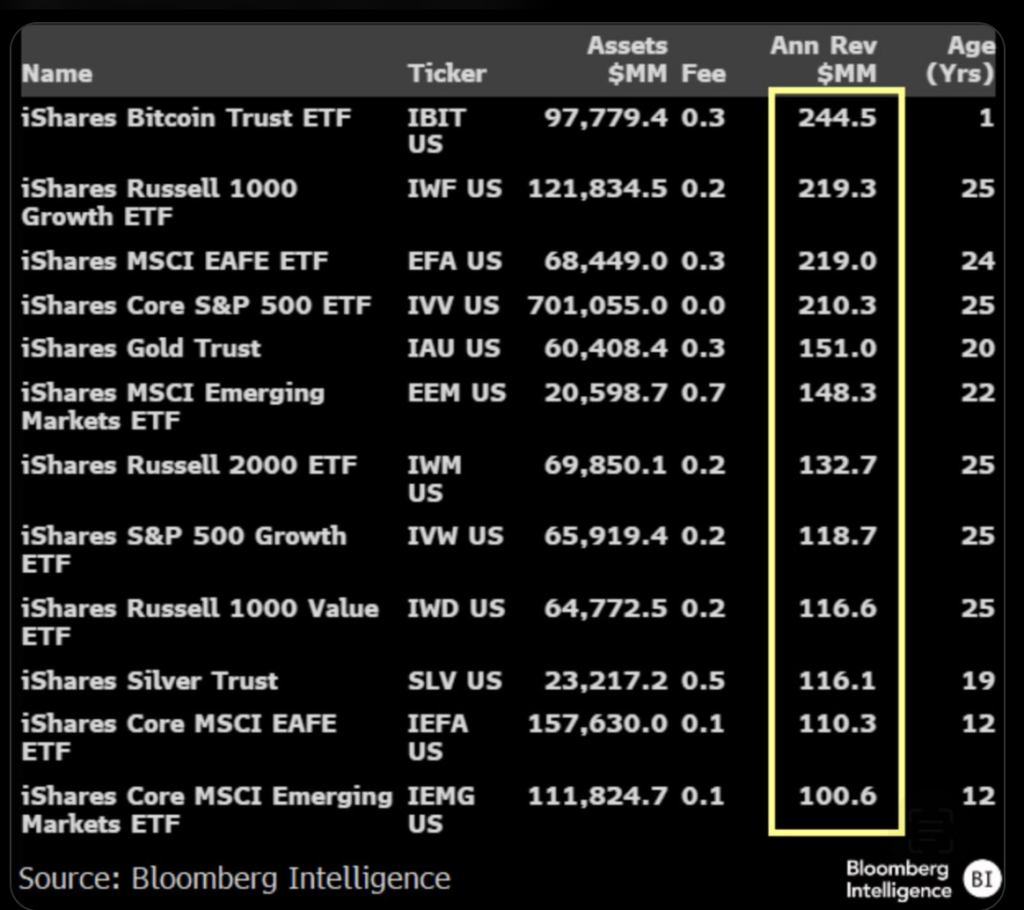 10 trilyon dolardan fazla varlığı yöneten ve bu anlamda dünyanın en büyüğü olan BlackRock, Bitcoin spot ETF’inden 2024 yılında 245 milyon dolarlık net gelir elde etti. Bloomberg ETF analisti Eric Balchunas’ın paylaştığı bilgiye göre IBIT fonu, 2025 başı itibarıyla iShares Russell 1000 Growth ETF’i (IWF) ile iShares MSCI EAFE ETF’ni (EFA) geride bıraktı.